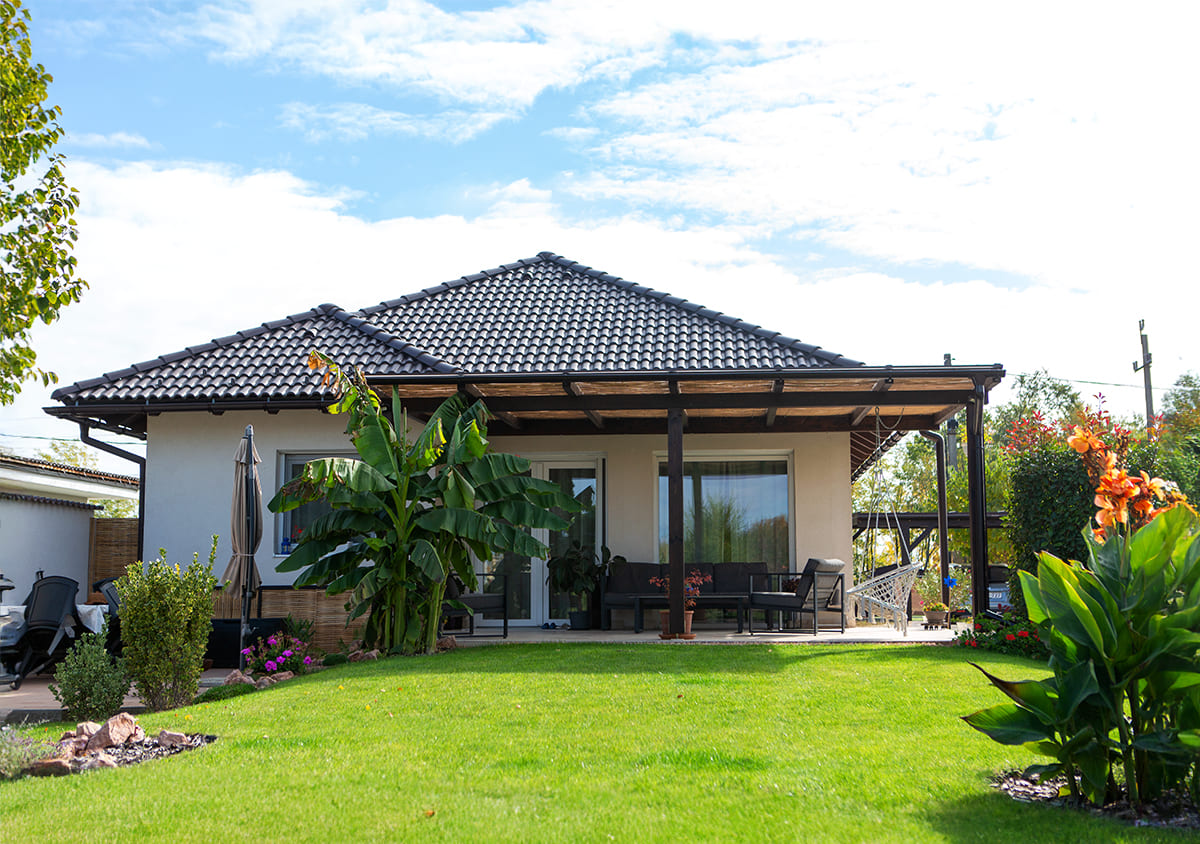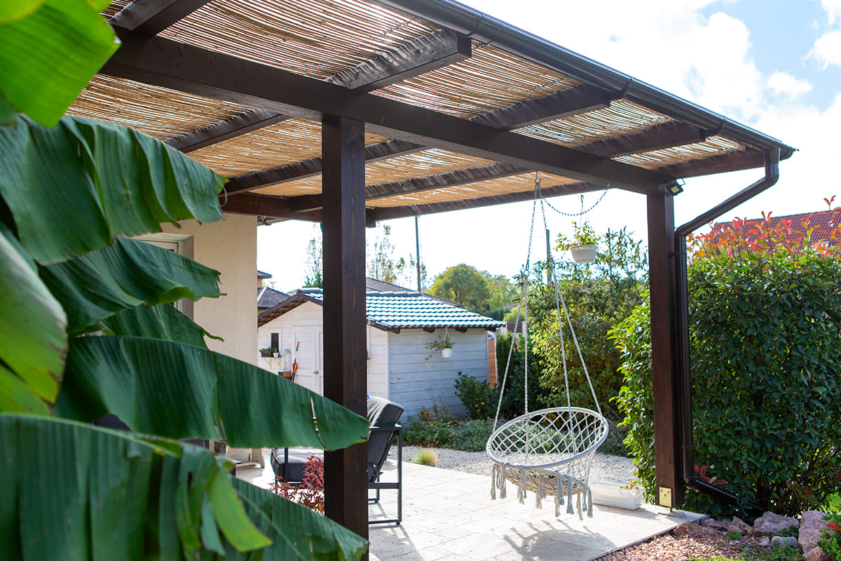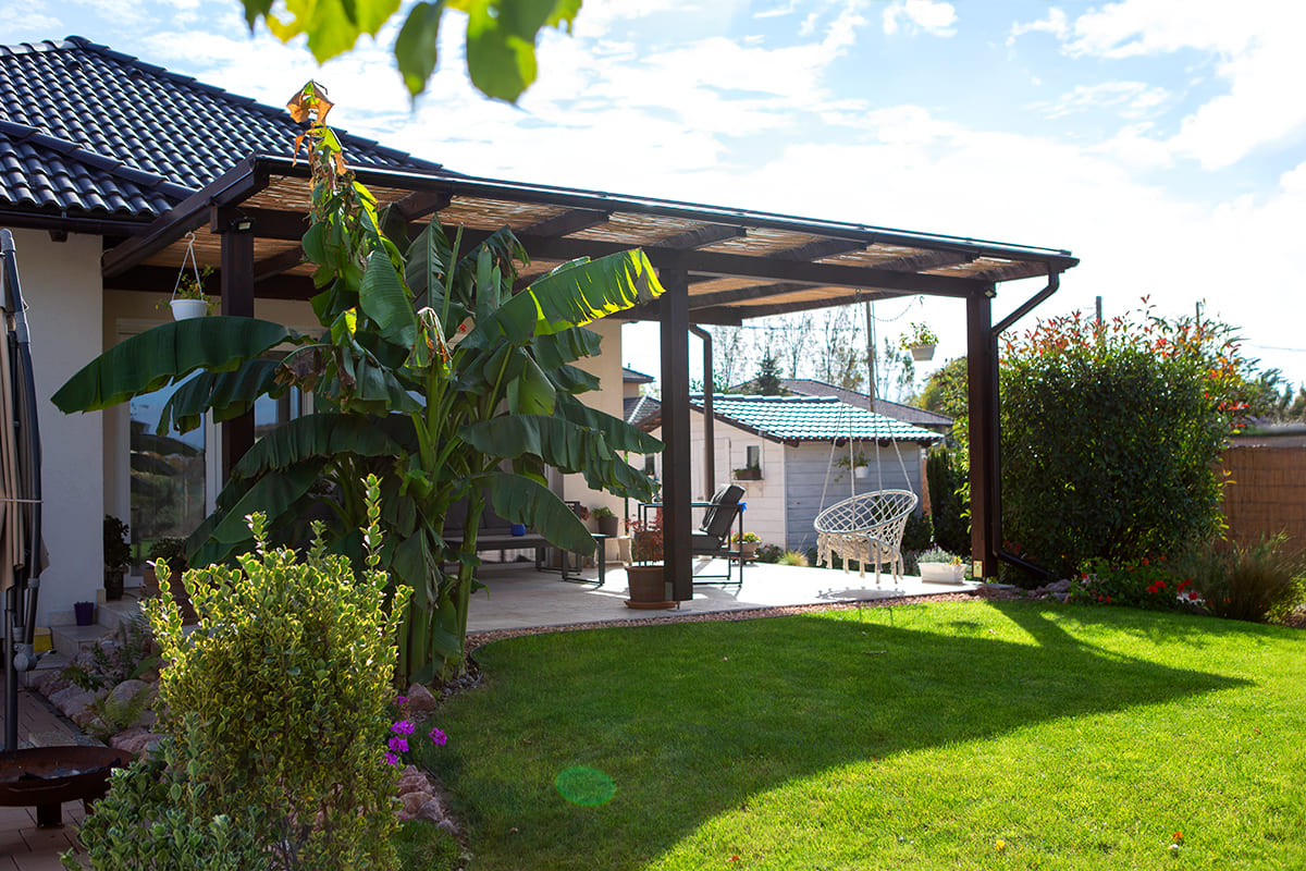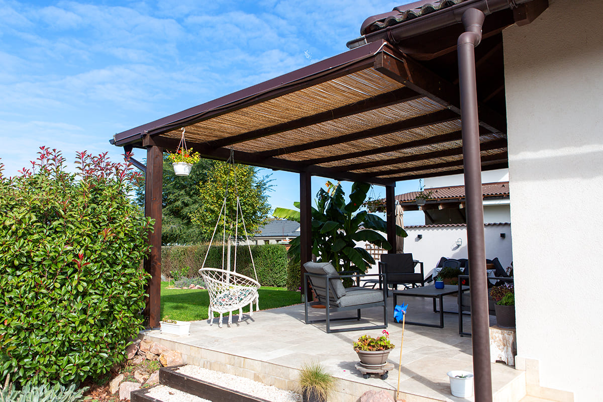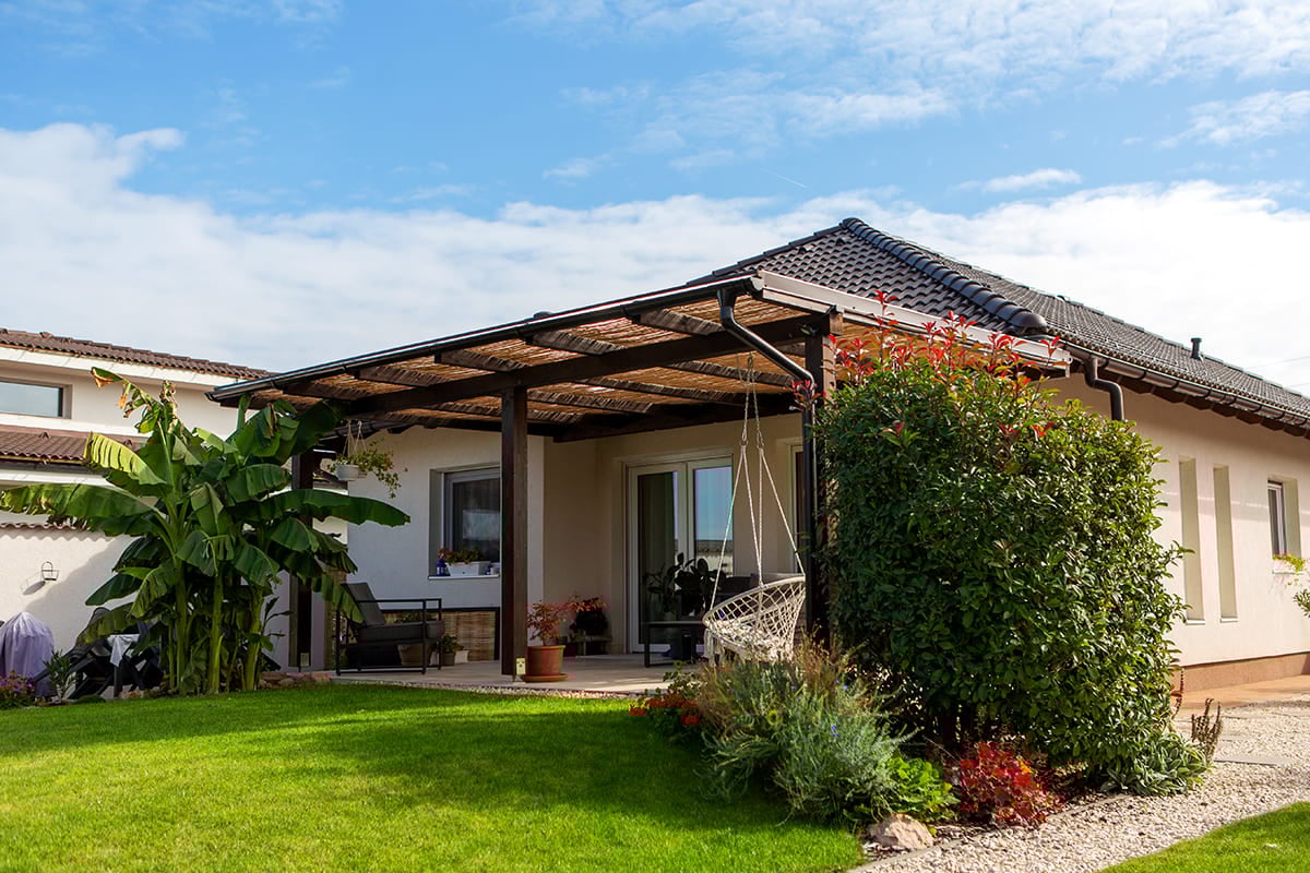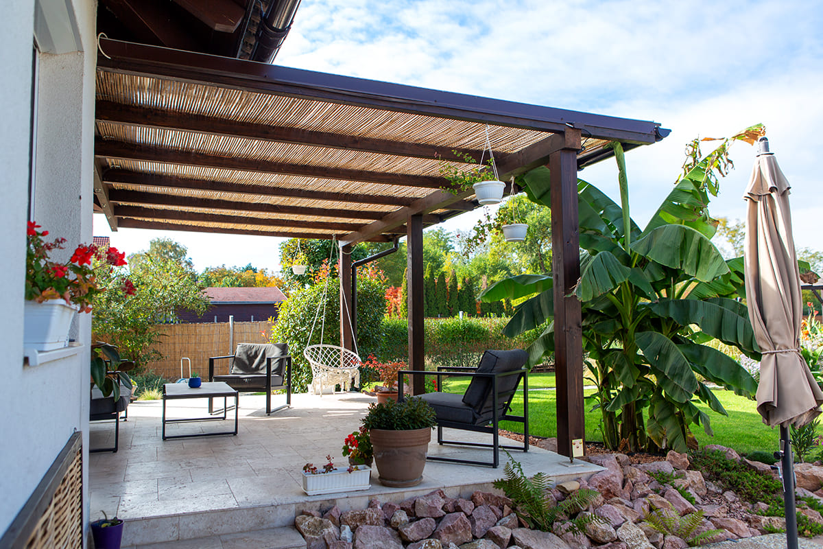 A hátsó terasz az otthon egyik legértékesebb kültéri tere, ahol a család és a vendégek kellemes órákat tölthetnek a szabadban. A teraszfedés kialakítása nemcsak praktikus árnyékolást biztosít, hanem esztétikailag is gazdagítja a kert kompozícióját. Ebben a projektben egy fa szerkezetű teraszfedést valósítottunk meg, amelyet az ügyfél kreatívan természetes nád árnyékolóval egészített ki, létrehozva ezzel egy harmonikus, természetközeli hangulatú pihenőteret.