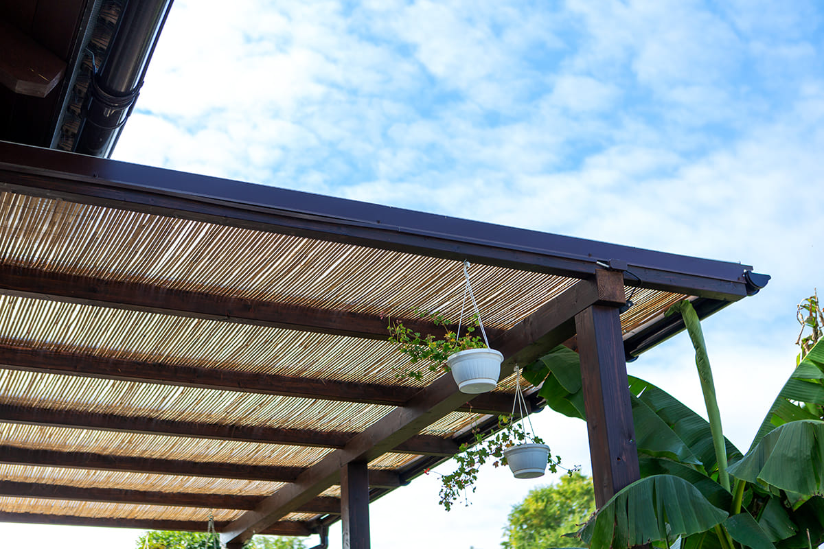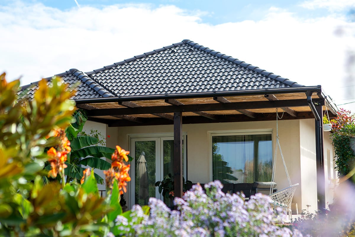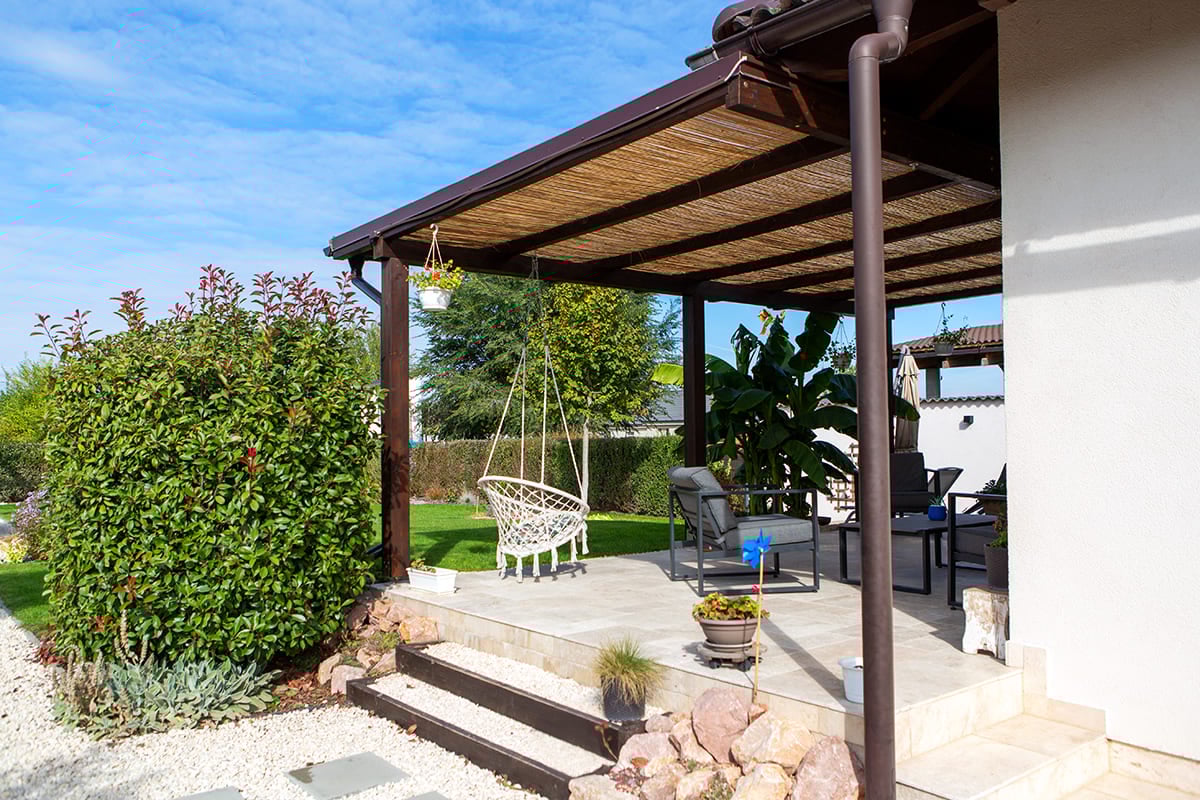 Az ügyfél kreatív megoldása, hogy a polikarbonát tető alá természetes nád árnyékolót helyezett el, egyedi karaktert kölcsönöz a teraszfedésnek. A nád borítás nemcsak esztétikai szempontból előnyös, hanem praktikus funkcióval is rendelkezik: tovább csökkenti a beérkező napfény intenzitását, így még kellemesebb árnyékot teremt a forró nyári napokon.