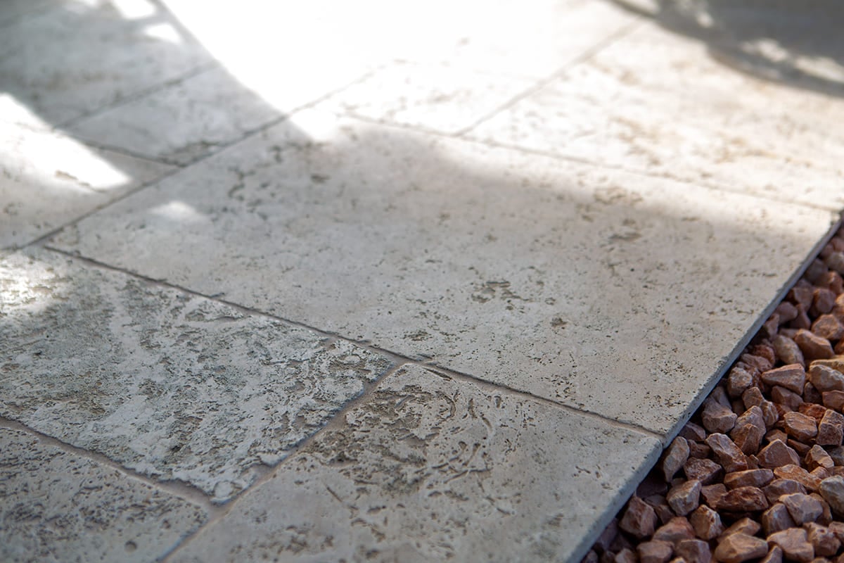 A fa teraszfedés szerkezete egyszerre biztosítja a stabilitást és a helytakarékos kialakítást. Az egyik oldalon három tartóoszlop került elhelyezésre, amelyek fém talplemezekkel a terasz kőburkolatába rögzítettük. Ez a megoldás szilárd alapot biztosít, miközben minimális beavatkozást igényel a kőburkolat szerkezetébe. A lábak rögzítésének a helyét ugyanazzal a kőburkolattal fedtük le, mint maga a terasz burkolata, így szinte észrevehetetlen a rögzítés, ami nagyon letisztult, igényes hatást kelt.