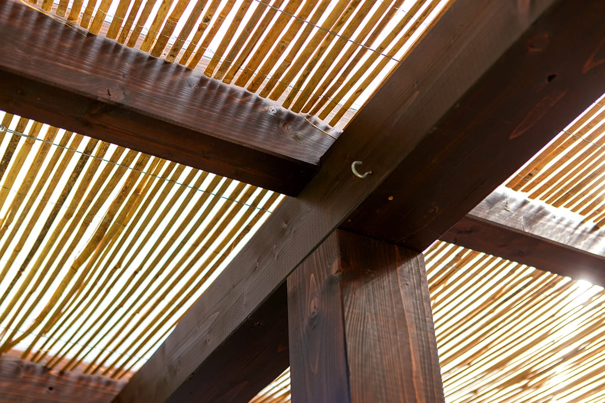 A barna lazúr nemcsak védelmet nyújt a fa számára, hanem meleg, természetes árnyalatával hozzájárul a harmonikus, természetes hangulat megteremtéséhez. A fa erezetének megőrzése tovább fokozza az autentikus, természetközeli hatást, amely alapvető eleme ennek az organikus stílusú teraszfedésnek. A fa szerkezet idővel még jobban beérik, patinát kap, ami tovább növeli karakterét és egyediségét.