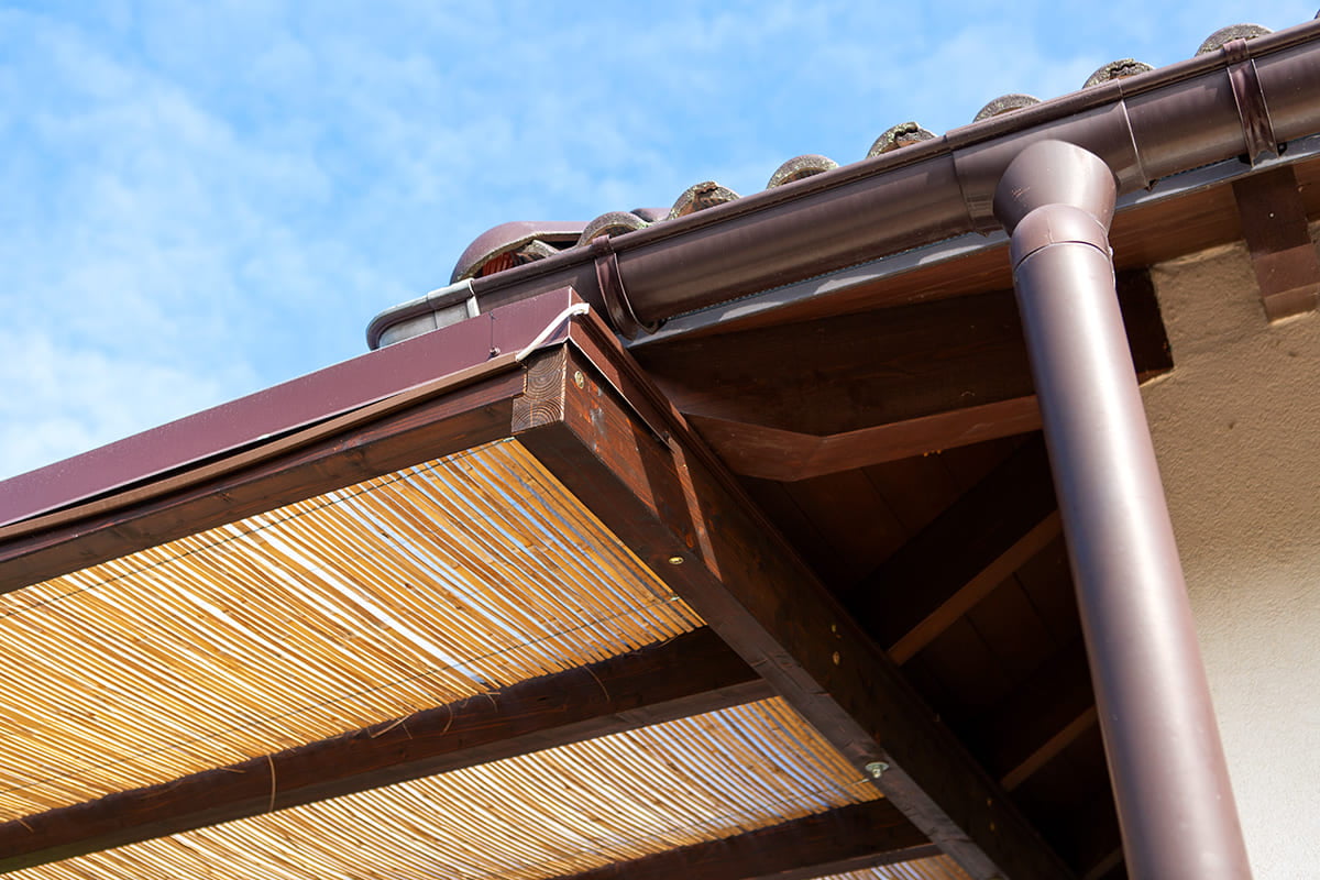 A teraszfedés vízelvezetése kritikus fontosságú a szerkezet hosszú távú működése szempontjából. Tudatosan választottuk a barna félköríves csatornarendszert, ami nemcsak funkcionális szerepet tölt be, hanem esztétikailag is harmonizál a fa szerkezet barna lazúrozásával, a félköríves megoldás pedig egyezik a házon már meglévő csatorna megoldással, így ennél a részletnél is figyeltünk az összhangra. A félköríves forma klasszikus megjelenést biztosít, miközben hatékonyan gyűjti össze és vezeti el a csapadékvizet.