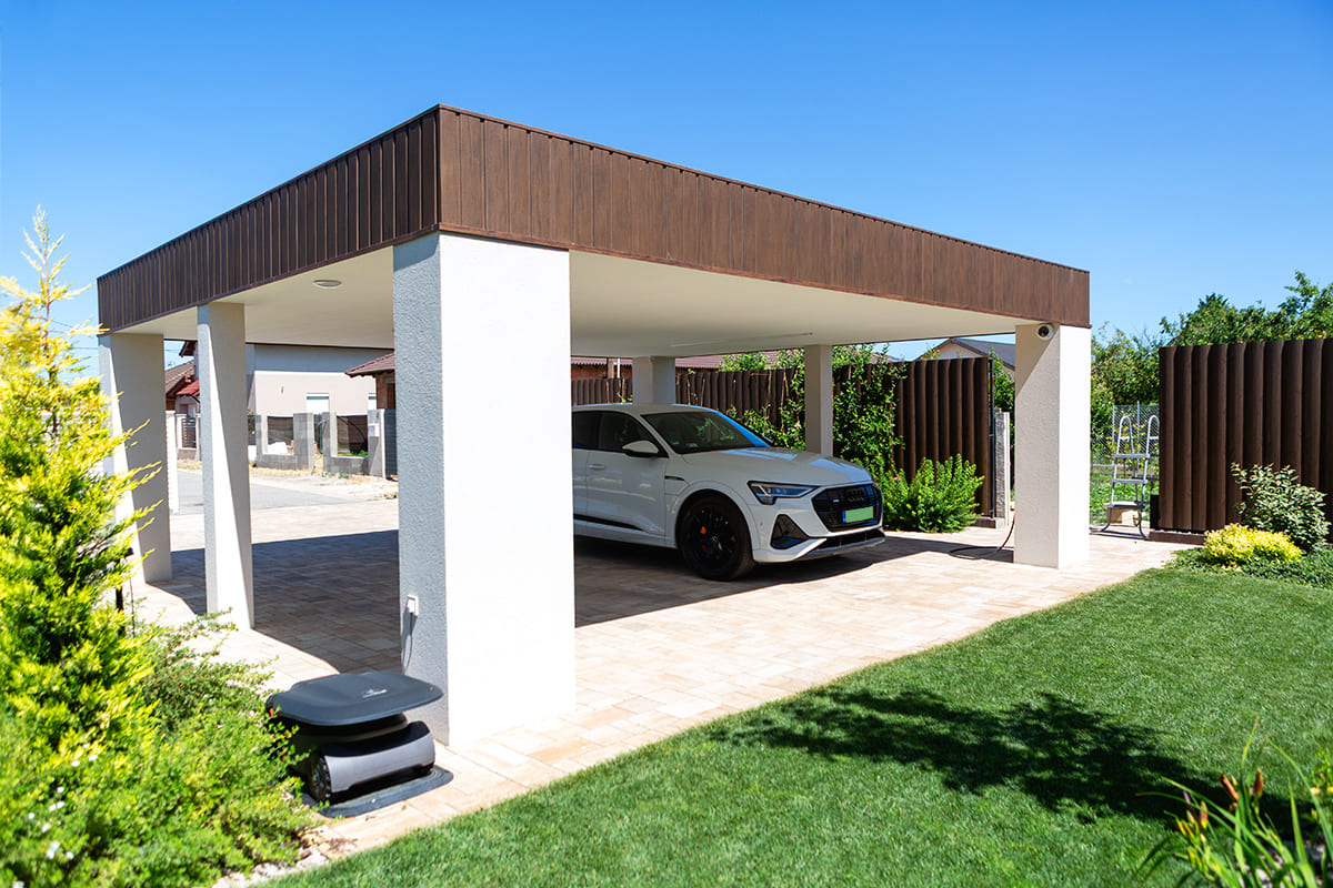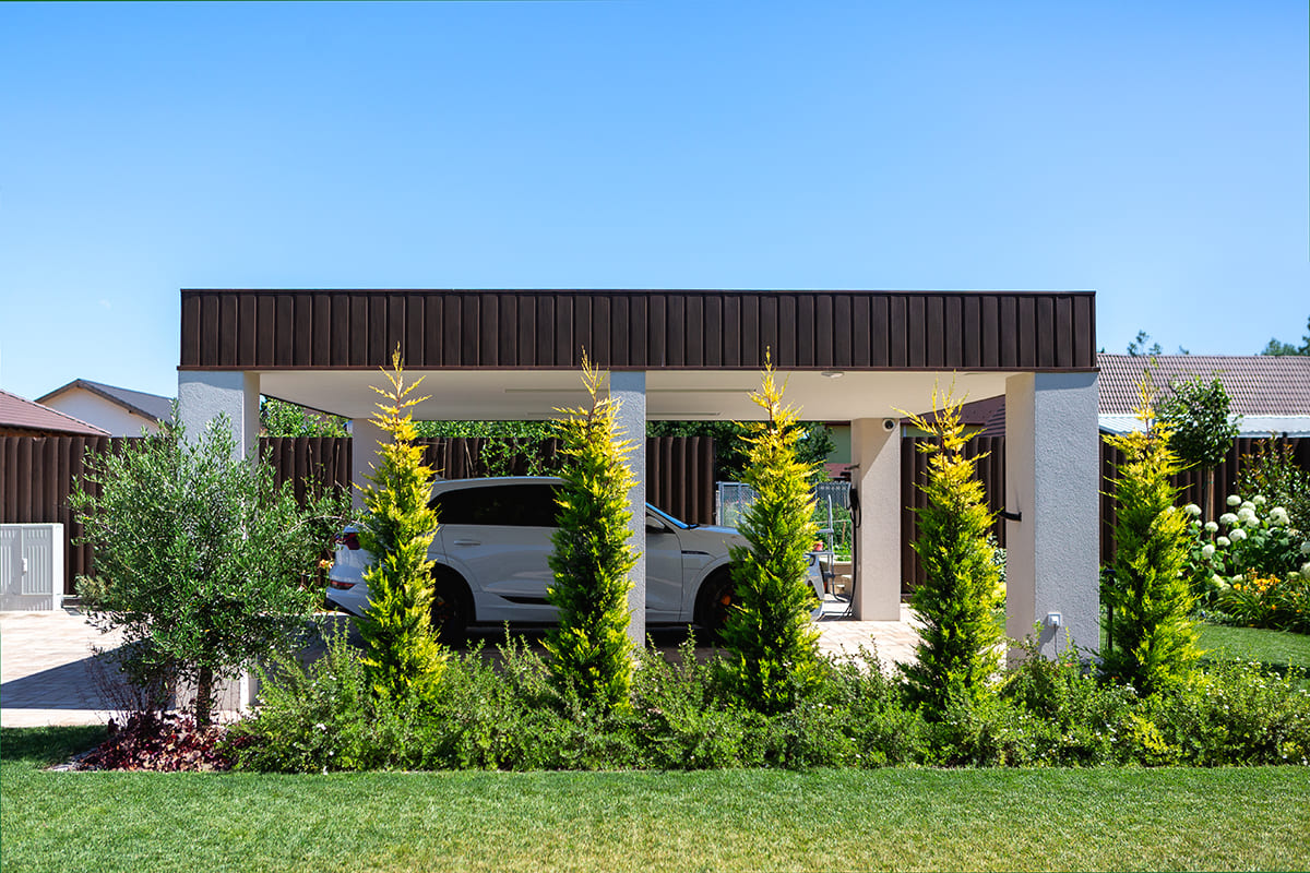 - Tökéletes illeszkedés – Az egyedi tervezésű autóbeálló pontosan igazodik a ház építészeti stílusához, színvilágához és a kerítés valamint a kert karakteréhez