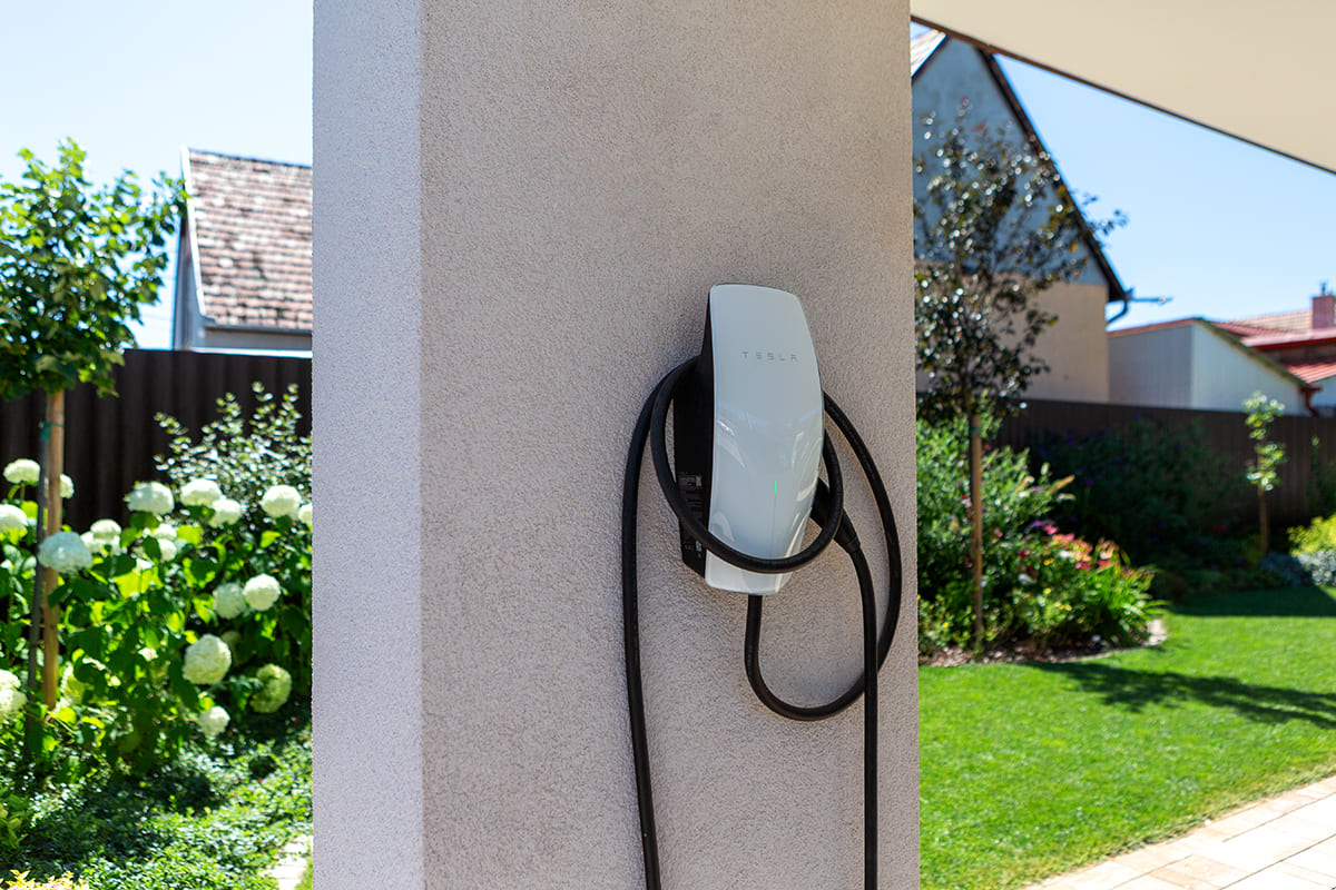 Már a tervezés fázisában figyelembe vettük az elektromos töltőállomás felszerelésének lehetőségét, így a szükséges vezetékeket és rögzítési pontokat az építés során integráltuk a szerkezetbe. Az elektromos töltőállomás az egyik vakolt oszlopra került felszerelésre, ahol a vakolt felület lehetővé tette a vezetékek rejtett elhelyezését – így a töltő esztétikusan, a beálló szerves részeként jelenik meg, nem lógnak látható kábelek és nem zavarja a letisztult megjelenést. Ha többet szeretne megtudni erről az egyedi megoldásról, tekintse meg a projekt részletes bemutatását.