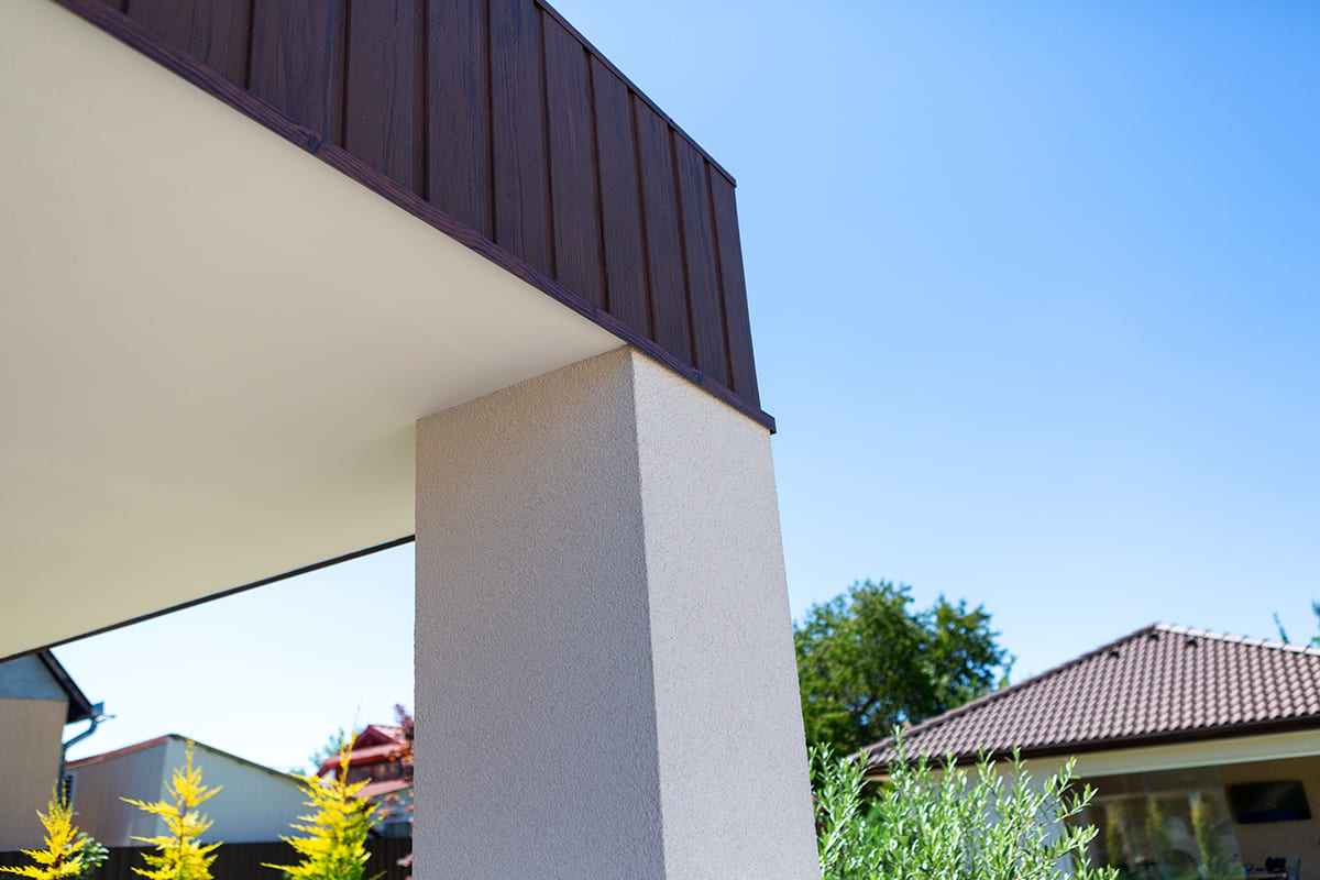 A projekt különlegessége a speciális tetőfedés kialakítása: a fa gerendákat burkolattal láttuk el, azaz dobozoltuk, majd a trapézlemez fedés köré magasabb, téglalap alakú keretet készítettünk, amelynek oldalfelületét barna, fa hatású burkolattal láttuk el, harmonizálva a környező kerítés színvilágával. A vízelvezetési rendszer közvetlenül a vakolt tartólábakba került integrálásra, így nincsenek külső, látható csatornák – a csapadékvíz a beburkolt szerkezetbe épített csatornákon keresztül a tartólábakba kerül, majd onnan jut el a talajszintre. Ez a megoldás különösen előnyös modern, minimalista kialakítású házak esetében, ahol minden felesleges vizuális elem zavarja az összképet.
