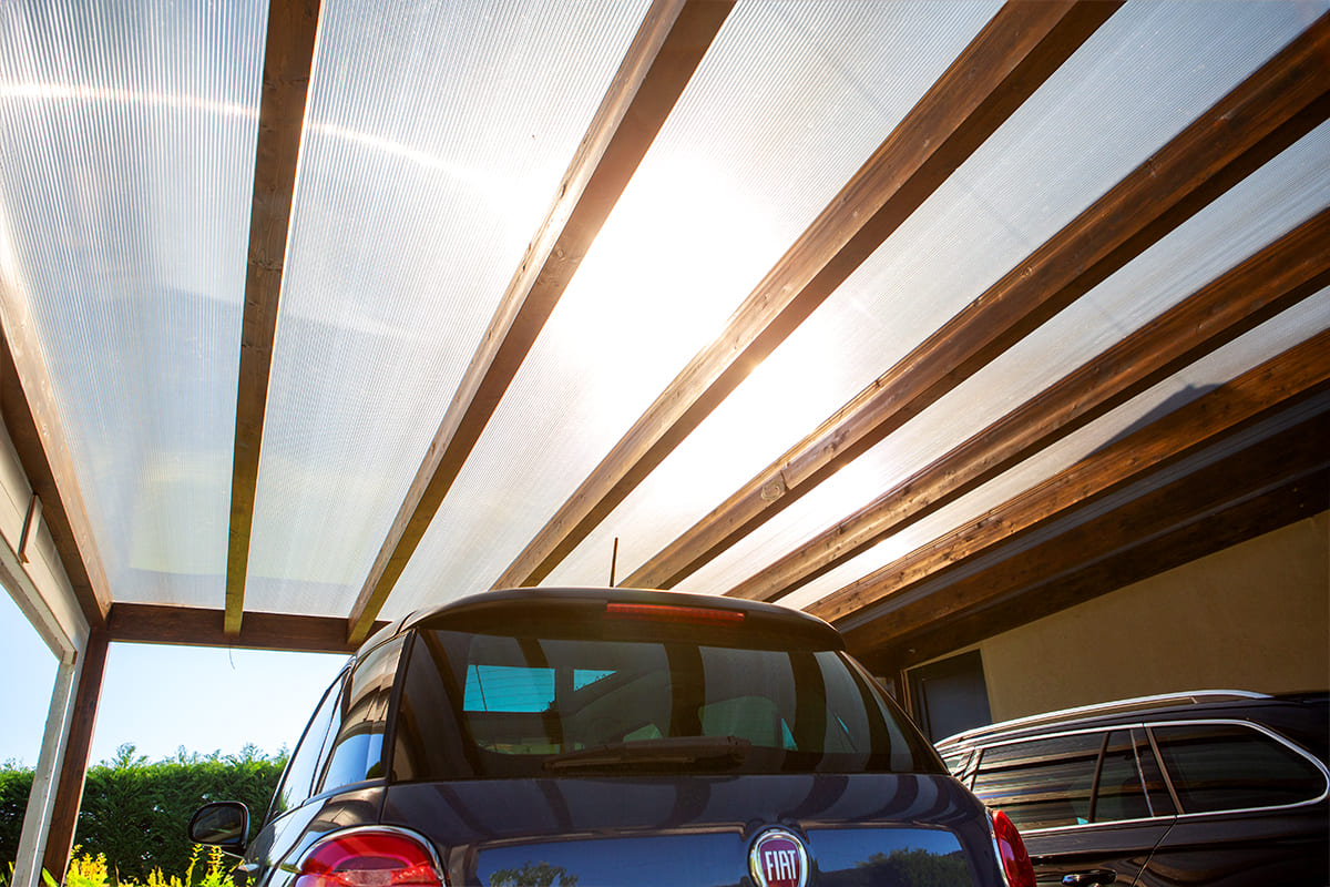 3. Kocsibeálló ötlet: Vakolt autóbeálló polikarbonát tetővel