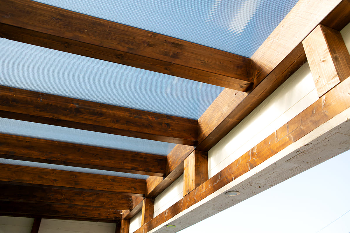 A tetőszerkezetet fagerendákon nyugvó polikarbonát lapokkal fedtük – a látható fa gerendák organikus textúrája harmonizál a terméskővel burkolt oszlopokkal, míg a polikarbonát tető modern funkcionalitást biztosít. Az anyag 100%-ban kiszűri az UV-sugárzást, megvédve a járművek fényezését és belső kárpitját, emellett ellenáll a jégesőnek és jelentős teherbírással rendelkezik. A félköríves csatornarendszer hatékonyan gyűjti össze és vezeti el a csapadékvizet, megakadályozva a pangást.
