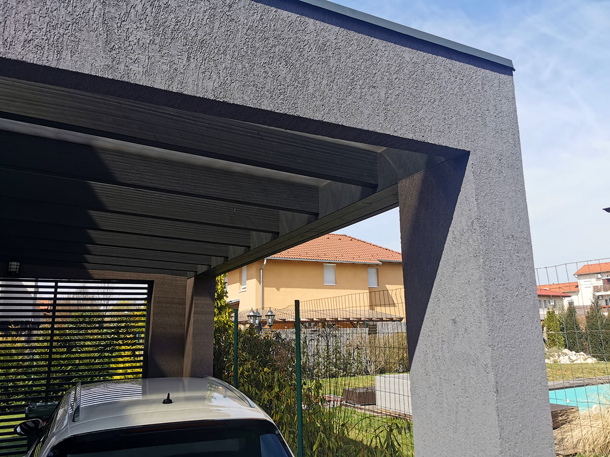 Harmadik projektünkben egy polikarbonát fedésű vakolt autóbeállót terveztünk és kiviteleztünk, amely tökéletesen illeszkedik a modern építészet letisztult vonalvezetéséhez és minimalista formavilágához. A fa szerkezetet egyenes vonalú kialakítással terveztük meg, majd az oszlopokat és a látható szerkezeti elemeket beburkoltuk és vakoltuk, a vakolat színét pedig a ház falazatához igazítottuk, így az autóbeálló nem különálló szerkezetként, hanem a ház építészeti koncepciójának folytatásaként jelenik meg. A projekt különlegessége a lécezéses oldalzárás, amely nem csak esztétikai elemet ad a szerkezetnek, hanem praktikus funkciót is ellát: átszellőzést biztosít, miközben diszkrét árnyékolást nyújt.