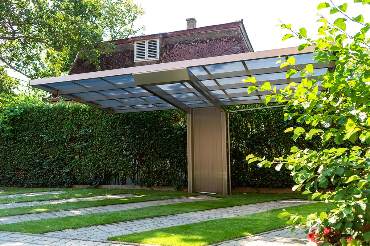Az opálos polikarbonát tető további előnye, hogy kiszűri az infravörös sugárzás 37%-át, amely csökkenti a beálló alatti hőmérsékletet nyáron, így a jármű belseje is hűvösebb marad. Az opálos fedés esztétikai szempontból is harmonikusan illeszkedik a rozsdamentes acél színű alumínium vázhoz, létrehozva egy egységes, letisztult megjelenést.