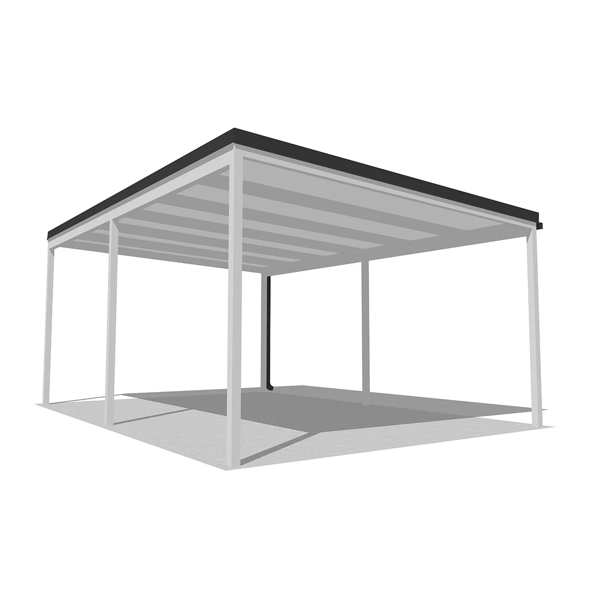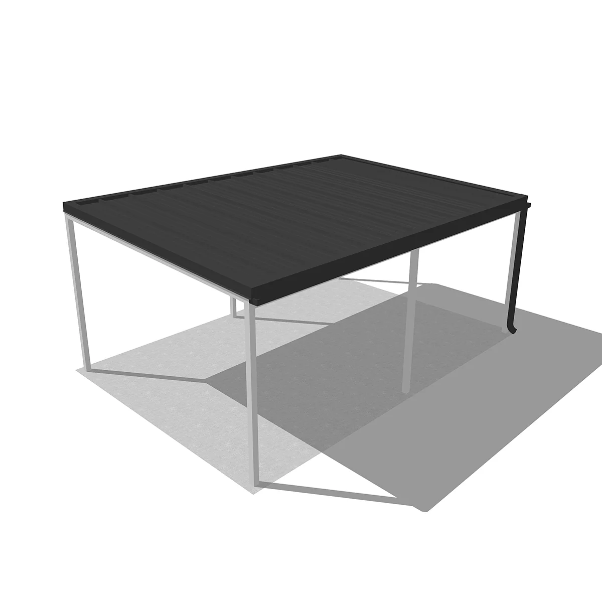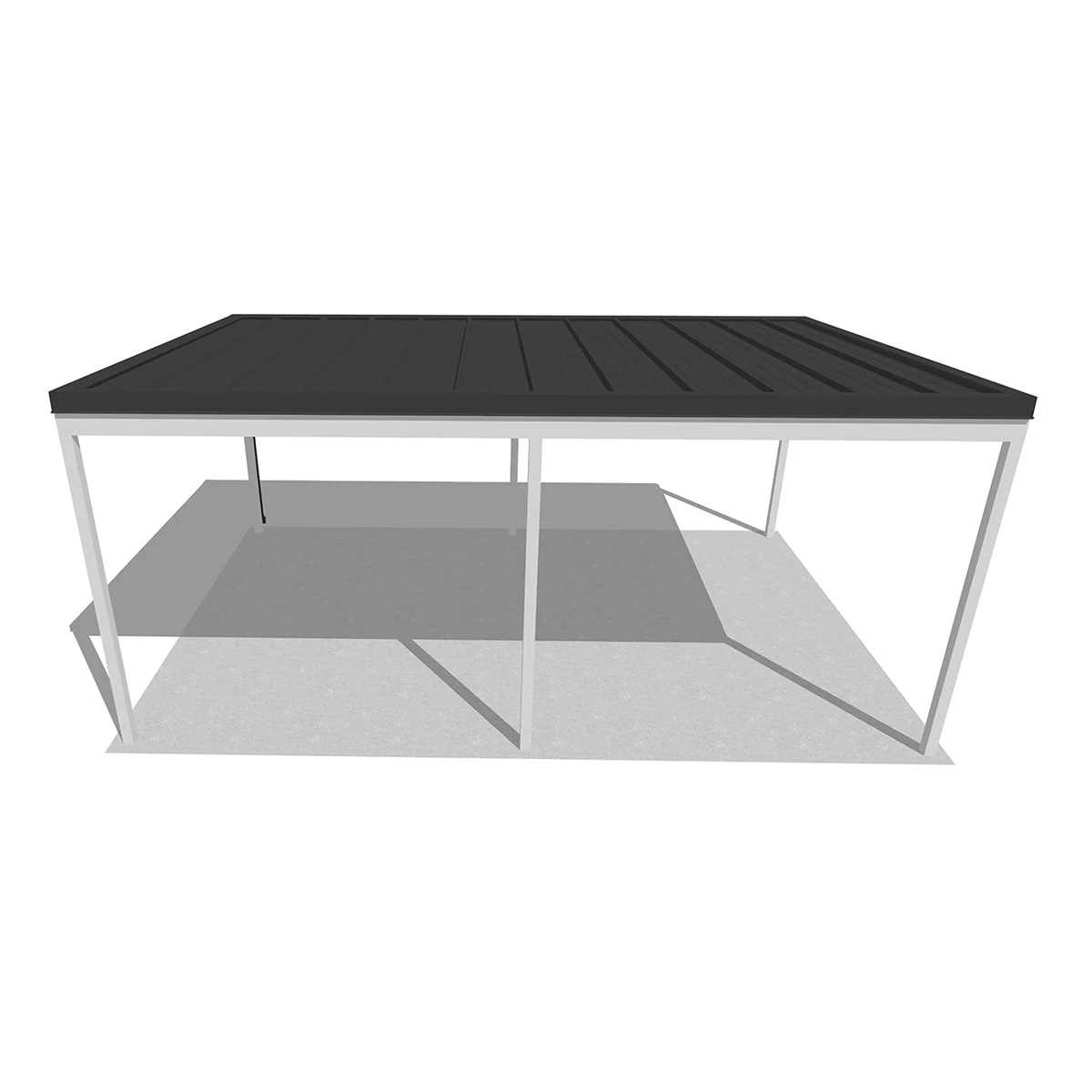A tető 6 oszlopon nyugszik, melyek két oldalra vannak rendezve és beton alapba kerülnek rögzítésre. A szerkezet fedése szendvicspanel, ami antracit és fehér színekben érhető el. A szendvicspanel tetők előnye, hogy nem engedik át a természetes fényt, így teljes árnyékban lesz az autója.