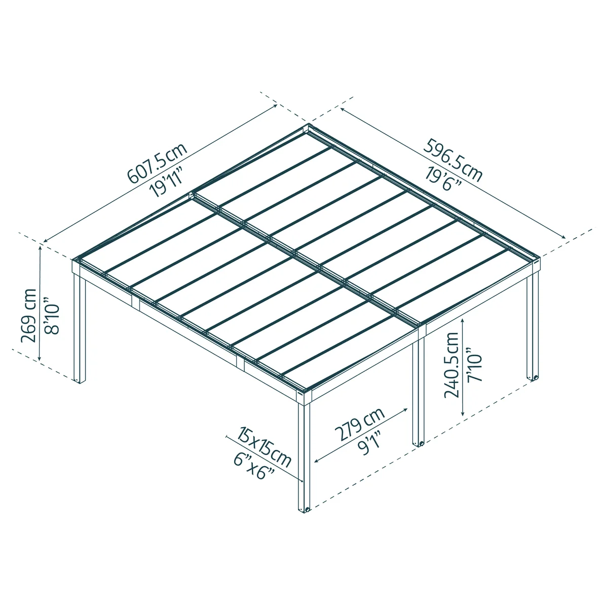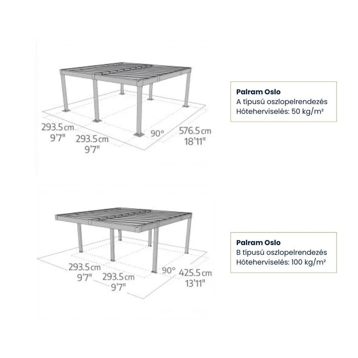 A standard dupla Palram OSLO autóbeállók 596.5 cm x 607.5 cm méretűek, de további méretekben is elérhető ez a sorozat: a három férőhelyes beálló: 901 cm x 607.5 cm és négy beállásos méretben is: 1195 cm x 607.5 cm. A tartószerkezet fekete, porszórt alumínium vázból áll, amely ellenáll a rozsdának es hosszú élettartamot biztosít. A szerkezet tágas és könnyen hozzáférhető 269 cm magas, valamint 279 cm-es bejárati szélességgel és 240 cm-es szabad belmagassággal rendelkezik, bőséges teret biztosítva a járművek számára.