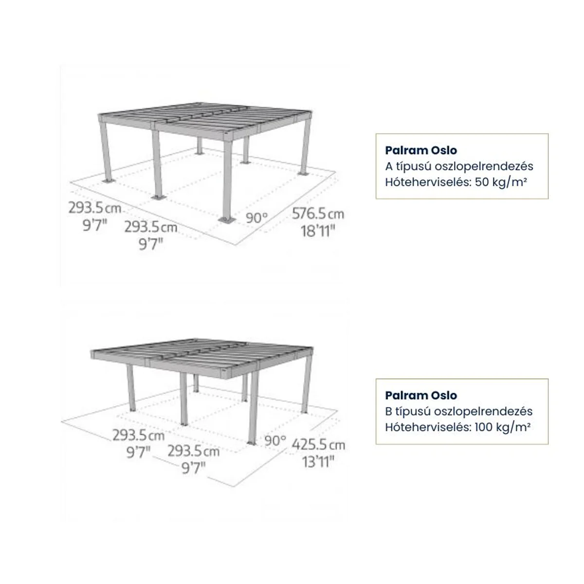 Hóteher: 50 kg/m² (amennyiben az oszlopok a szerkezet szélén helyezkednek el) és 100 kg/m² (ha az oszlopokat a tető szélétől 120 cm-rel beljebb szerelik)