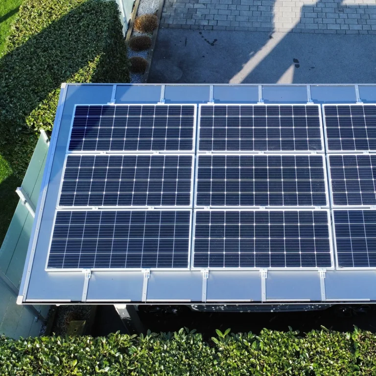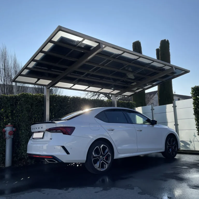 A tető 2 oszlopon nyugszik, melyek egy oldalra rendezettek és beton alapba kerülnek rögzítésre. A tető fedése opálos, vagy füst színű polikarbonát, mely 100%-osan visszaveri az UV sugarakat és 37 / 81%-ban pedig szűri az infravörös fény tartományt is. A napelem panelek erre a tetőre kerülnek ráépítésre.