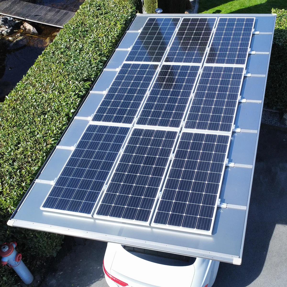 A tető 2 oszlopon nyugszik, melyek egy oldalra rendezettek és beton alapba kerülnek rögzítésre. A tető fedése opálos, vagy füst színű polikarbonát, mely 100%-osan visszaveri az UV sugarakat és 37 / 81%-ban pedig szűri az infravörös fény tartományt is. A napelem panelek erre a tetőre kerülnek ráépítésre.