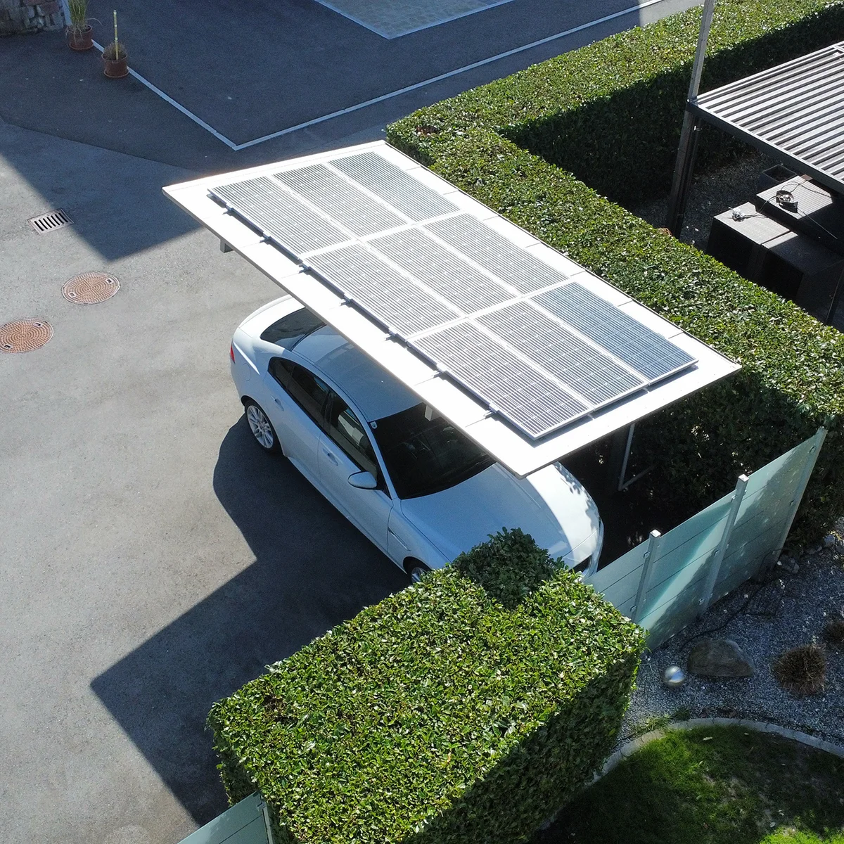 A tető 2 oszlopon nyugszik, melyek egy oldalra rendezettek és beton alapba kerülnek rögzítésre. A tető fedése opálos, vagy füst színű polikarbonát, mely 100%-osan visszaveri az UV sugarakat és 37 / 81%-ban pedig szűri az infravörös fény tartományt is. A napelem panelek erre a tetőre kerülnek ráépítésre.