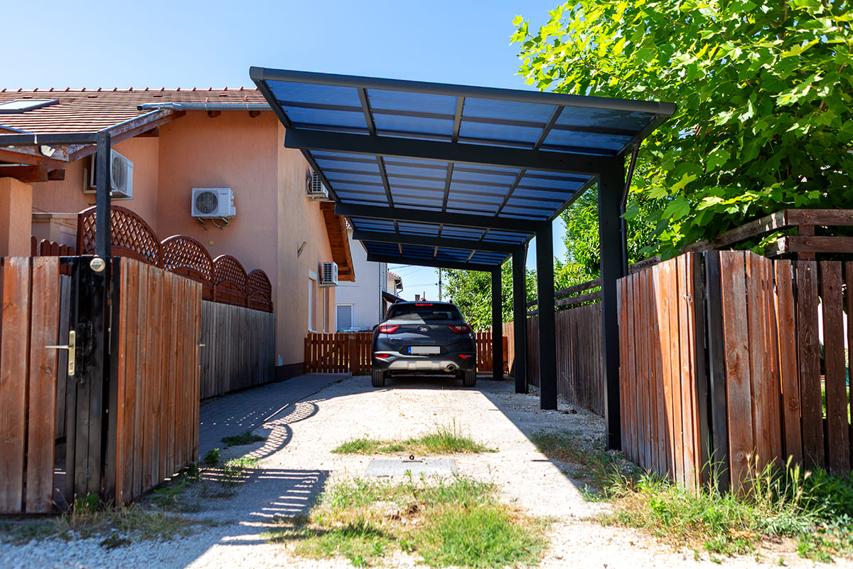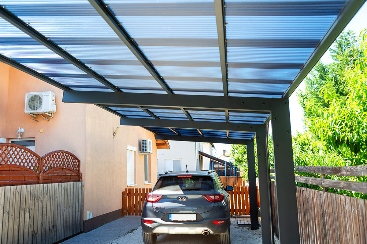 Ximax Wing autóbeálló egyenes tetővel, alumínium szerkezettel és polikarbonát fedéssel.