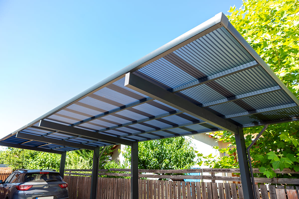 A tető 4 oszlopon nyugszik, melyek egy oldalra rendezettek és beton alapba kerülnek rögzítésre. A tető fedése füst színű polikarbonát, mely 100%-osan visszaveri az UV sugarakat és 37 / 81%-ban pedig szűri az infravörös fény tartományt is.